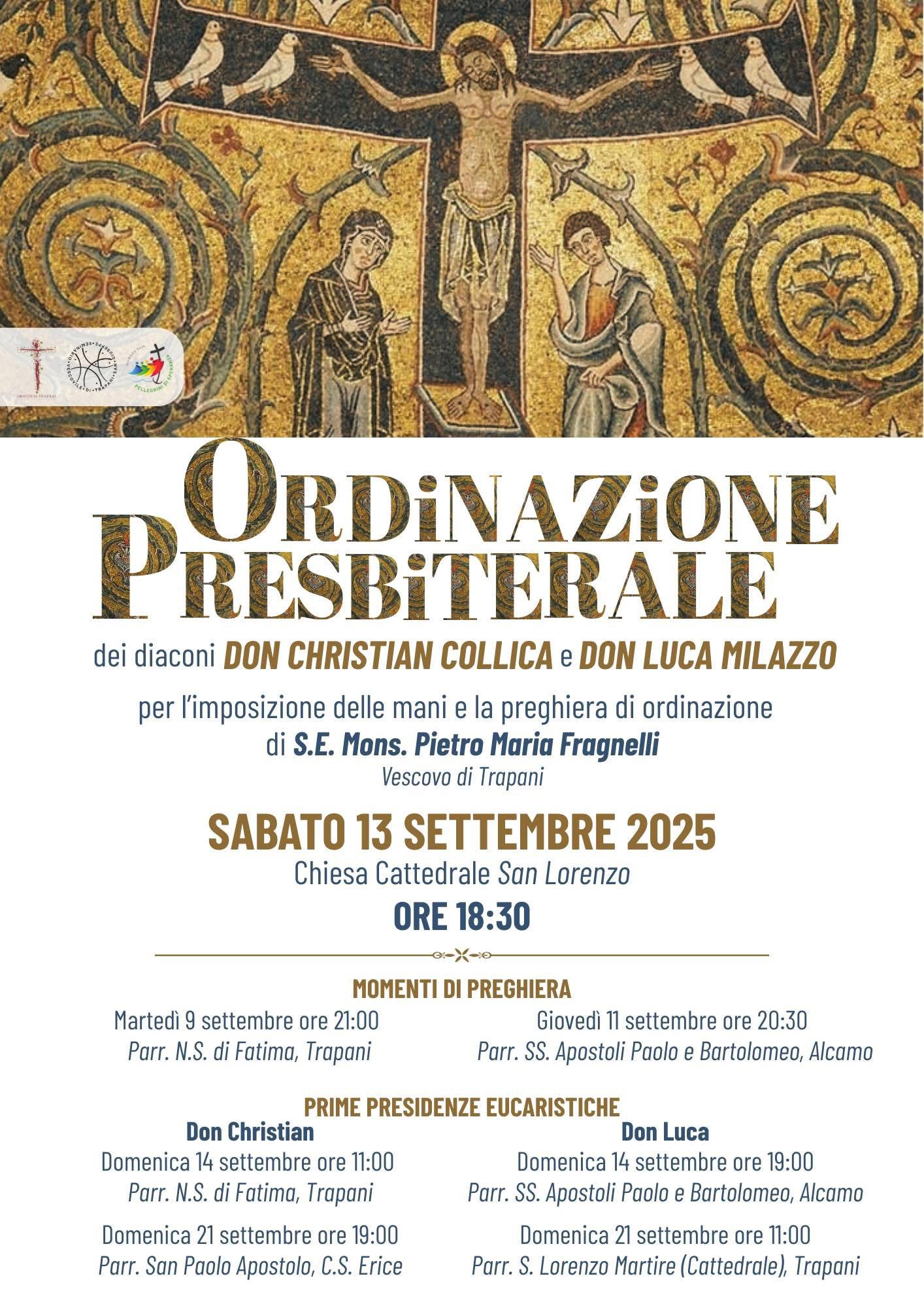 Sabato 5 gennaio 2019, alle ore 18.30, nella Chiesa Cattedrale di Trapani, per l’imposizione delle mani e la preghiera di ordinazione del vescovo Mons. Pietro Maria Fragnelli, sarà ordinato presbitero il diacono do..